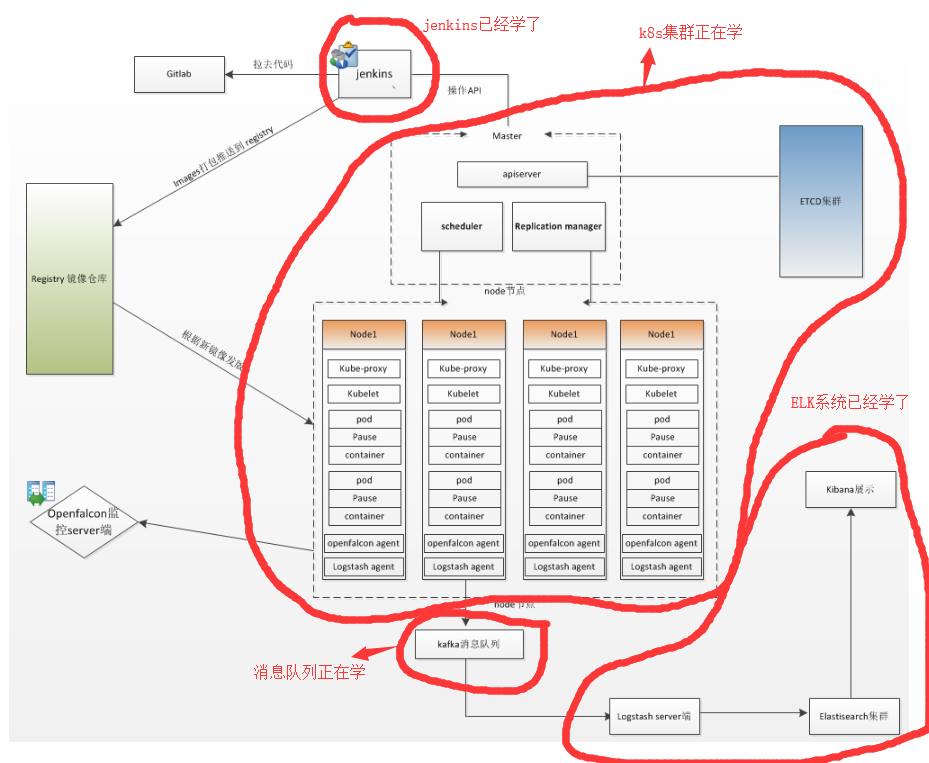 刚才在别人博客上看到一个图很有意思,我们总监叫我学了ELK日志系统,jenkins自动构建工具,最近在搞k8s,还差消息中间件没学,然后就看到了这个图,顿时整个公司要搭建的分布式服务器环境一目了然,由于我不是架构师并不知道公司整个服务器分布式系统是怎样的,现在才恍然大悟,原来如此,原来如此,原来如此呀。