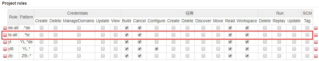 # 配置Project roles,根据正则匹配对不同用户分配不同项目的不同权限(此处框内意义是角色te-all具有所有te结尾的项目的构建权限);