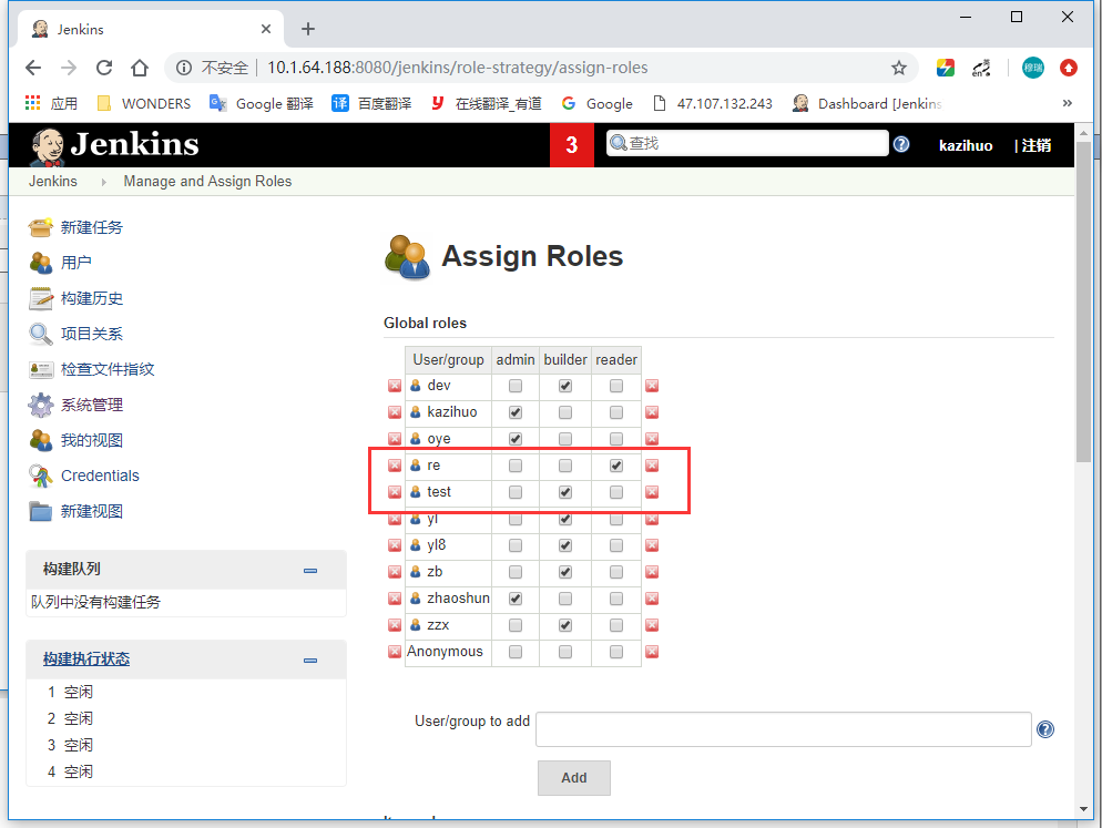 # 配置re账号的全局可读权限和test账号的全局构建权限;