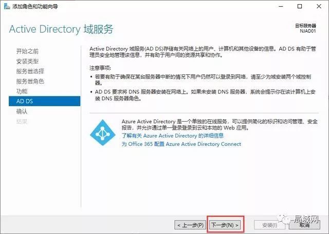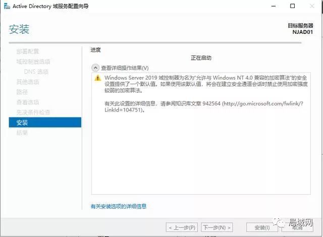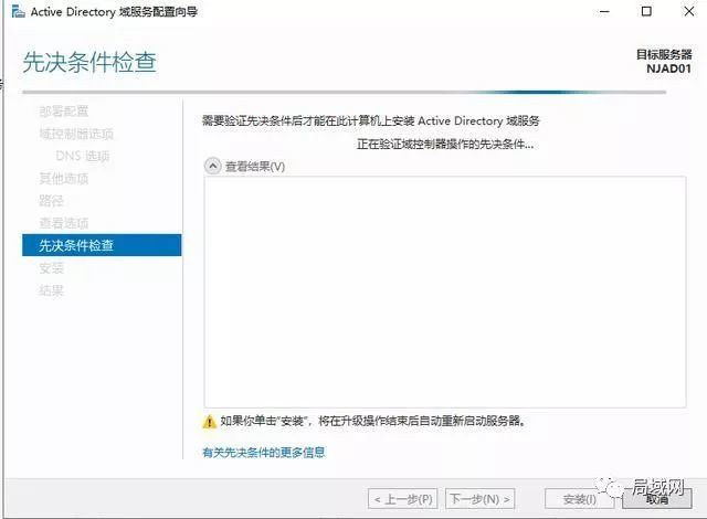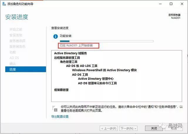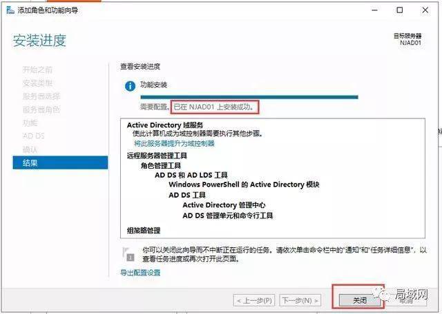15、看到已在NJAD01上安装成功,说明AD域的角色添加成功了。那是不是AD域现在就配置完成了呢?