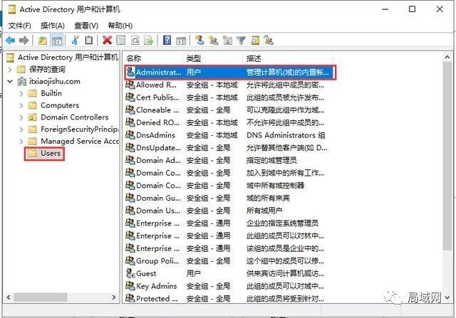 32、进入“Active Directory用户和计算机”后,找到Users可以查找到Administrator等用户。