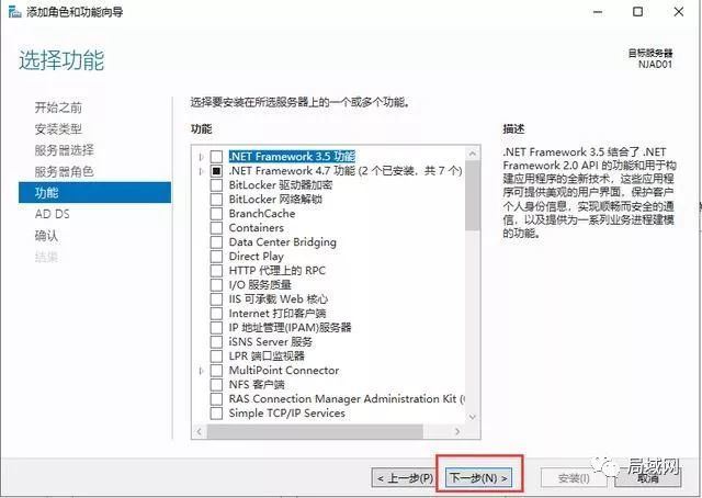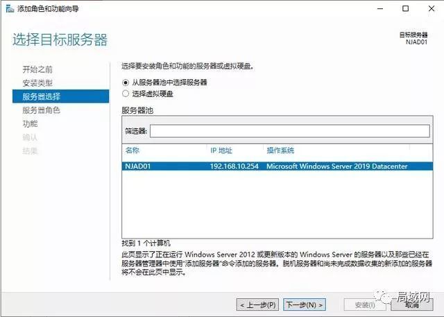 7、“从服务器池中选择服务器”,现在只有一台,所以默认就选择NJAD01,下一步。