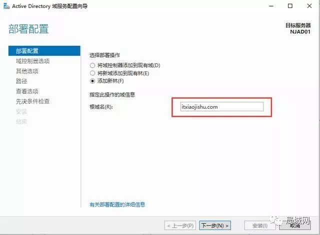 17、部署配置,如果是公司的首台域控制器,选择“添加新林”,自定义公司的根域名,域名命令规则xxx.com,为什么要用.com结尾呢?一般来说.com注册用户为公司或企业。