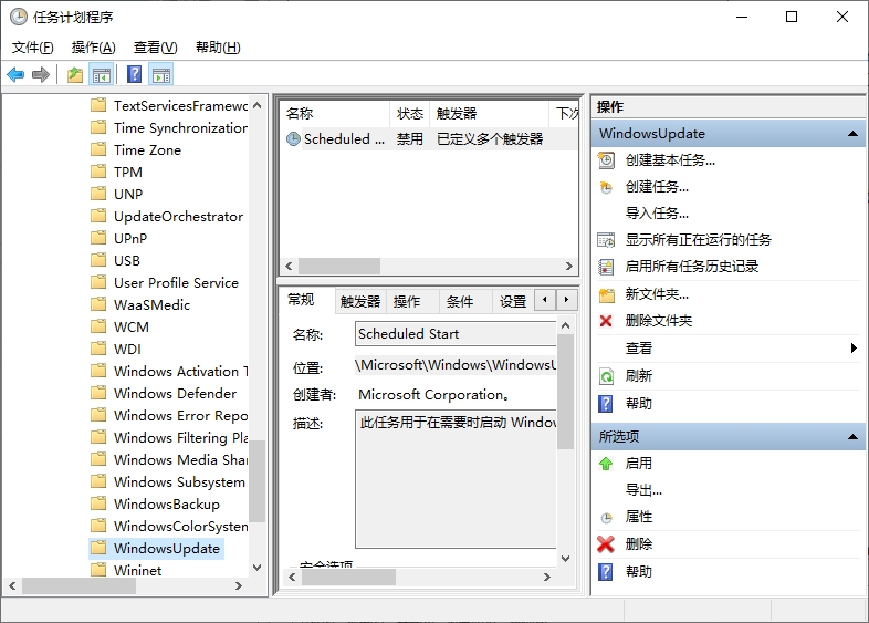 2、在任务计划程序的设置界面,依次展开 任务计划程序库 -> Microsoft -> Windows -> WindowsUpdate,把里面的项目都设置为 [ 禁用 ] 就可以了。(我这里边只有一个任务,你的电脑里可能会有2个或者更多,全部禁用就行了)