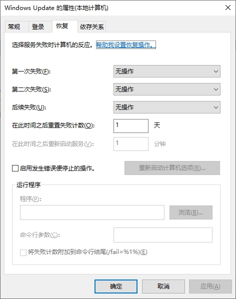 4、接下再切换到“恢复”选项,将默认的“重新启动服务”改为“无操作”,然后点击“应用”“确定”。
