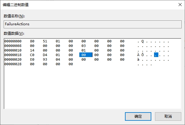 4、继续在右侧找到“FailureActions”键,右键点击修改该键的二进制数据,将“0010”、“0018”行的左起第5个数值由原来的“01”改为“00”,完成后,点击下方的“确定”即可,如下图所示。