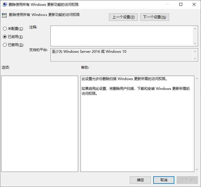 4、之后还需要再找到“删除使用所有Windows更新功能的访问权限”,选择已启用,完成设置后,点击“应用”“确定”,如图所示。