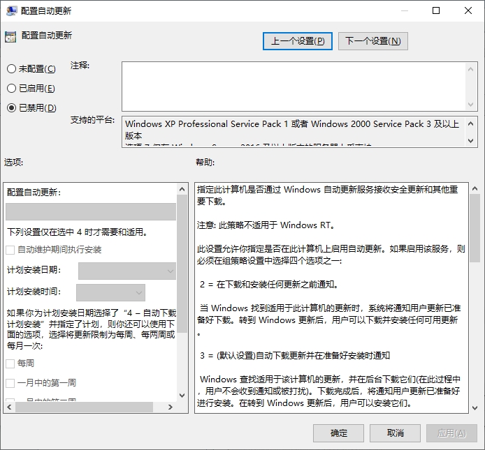 3、然后在右侧“配置自动更新”设置中,将其设置为“已禁用”并点击下方的“应用”然后“确定”,如图所示。