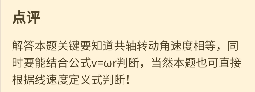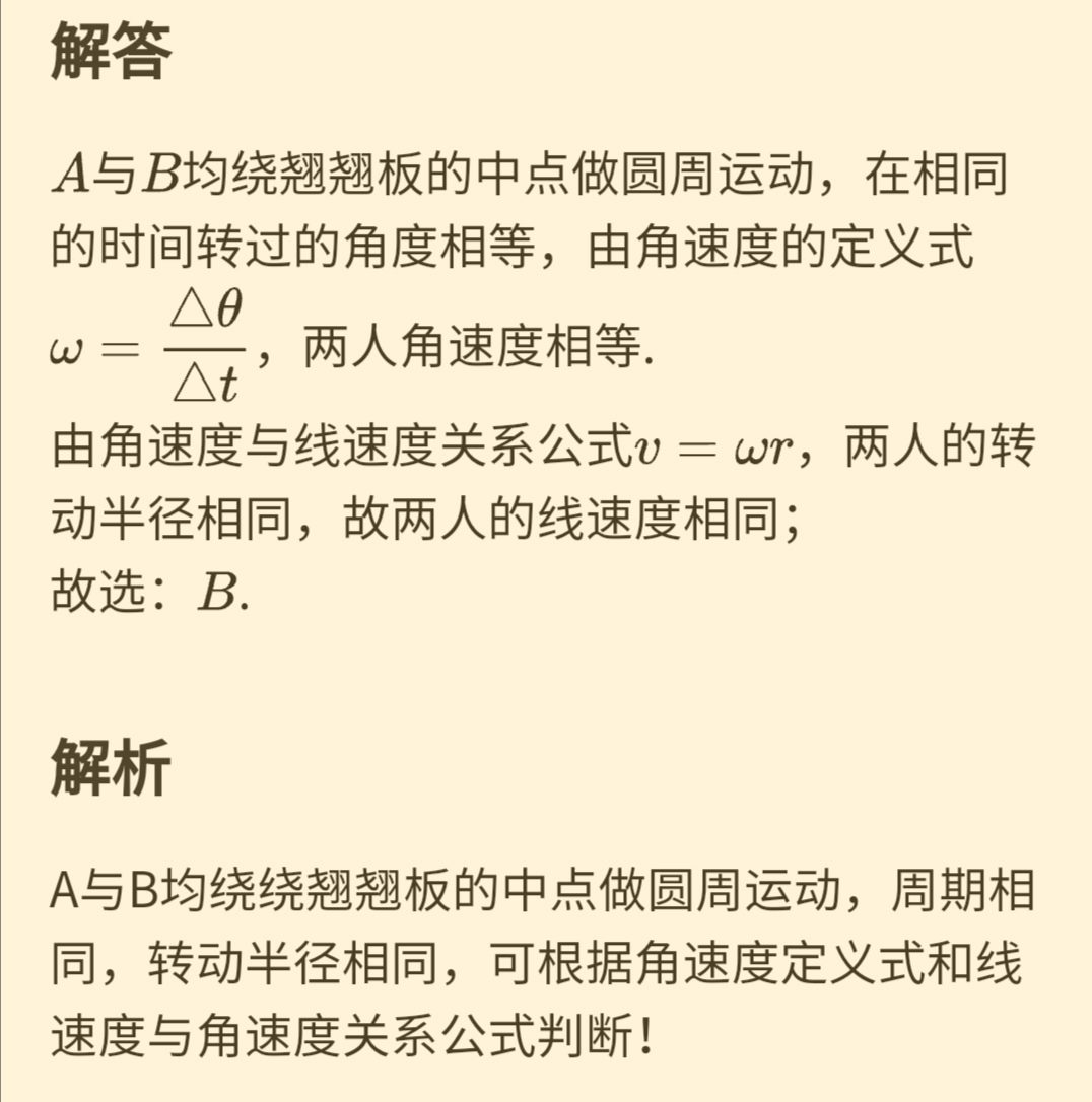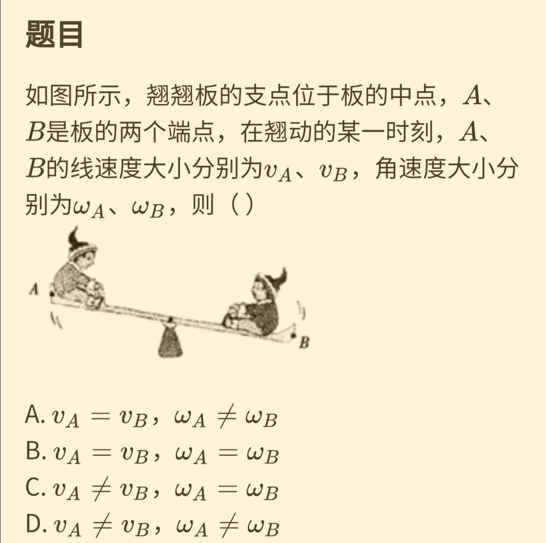 疑惑点:支点在中点,跷跷板旋转轨迹应该是以支点为圆心的圆,AB两点均在该圆上,因此可看做同轴转动,角速度相等,半径相同,线速度相等,我认为应选C