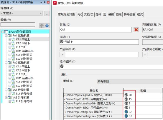 3.建立此次报价将用到的特殊属性如:设计人工时、安装人工时、用气量、调试费等,并将经验数据完善到相应的预规划的规划对象中,如图3建立特殊属性所示;