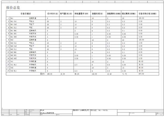 当完成产线设计之后,通过Eplan软件自动报表功能,将该生产的报价报表生成出来,如图7生产线报价总览表所示。