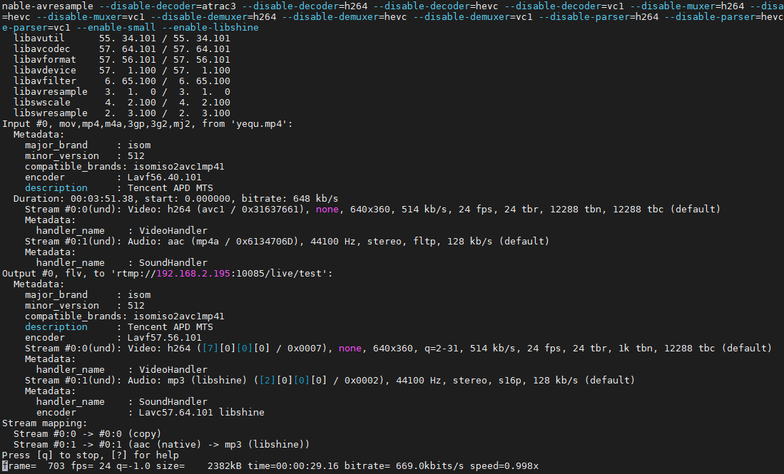 ffmpeg -re -i 1.mp4 -acodec mp3 -ar 44100 -vcodec copy -f flv "rtmp://192.168.2.195:10085/live/test"