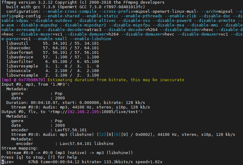 ffmpeg -re -i 1.MP3 -acodec mp3 -ar 44100 -f flv "rtmp://192.168.2.195:10085/live/test"