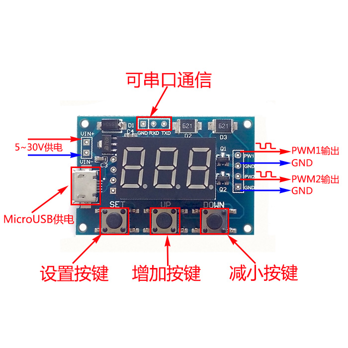 模块有3路按键分别是:Set、Up、Down;