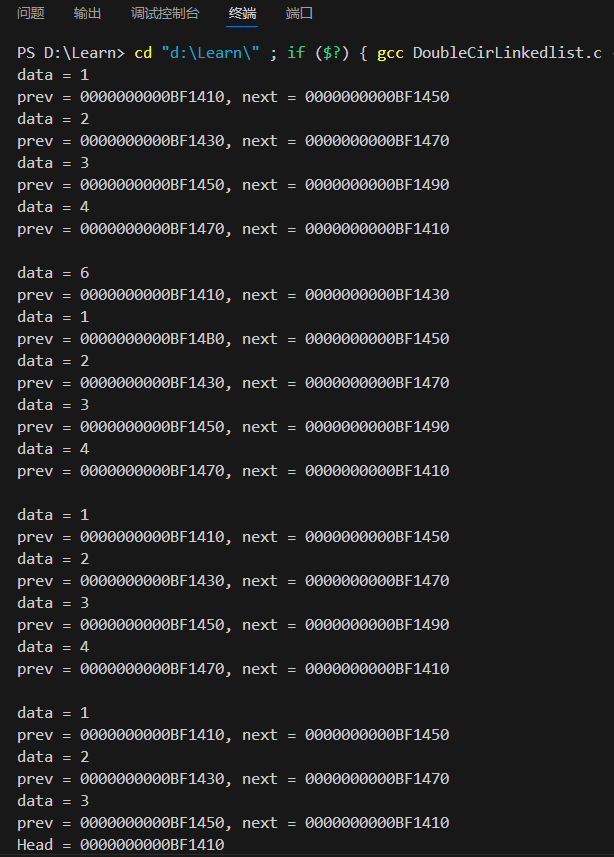 printf("prev = %p, next = %p\n", (void *)Phead->prev, (void *)Phead->next);