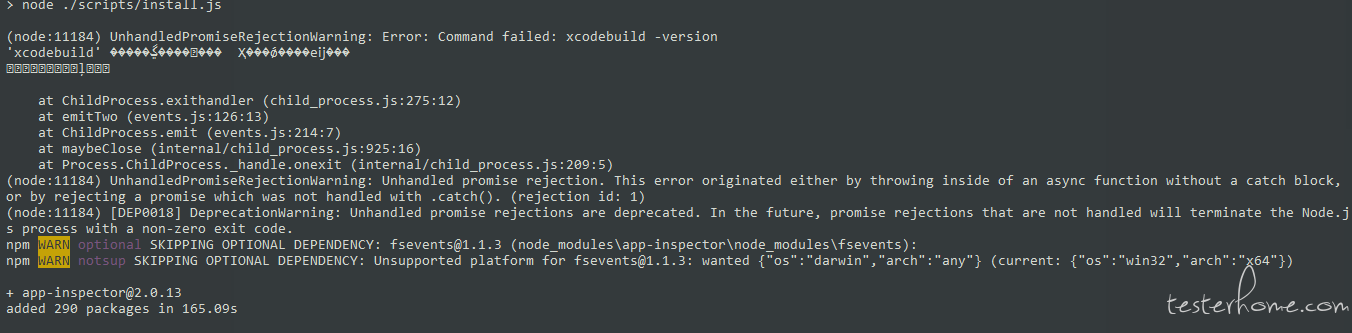 3.Windows下,安装app-inspector报错 提示 xcodebuild 的问题,出现如图提示