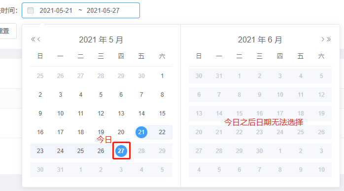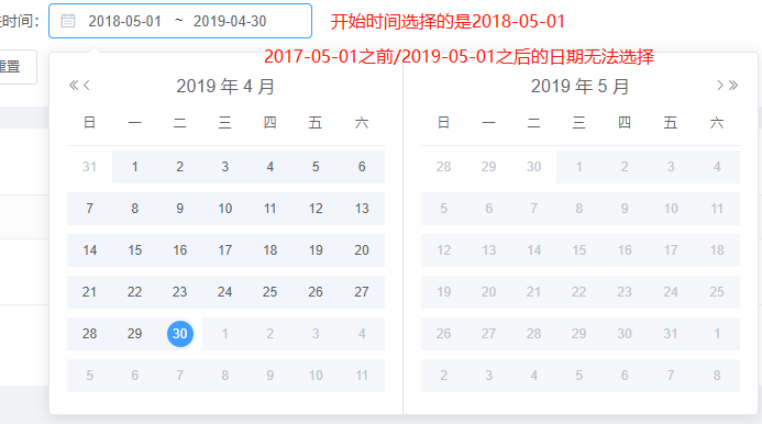 startEndDate: '', // 选择的开始日期 pickerOptions: { disabledDate(time) { return _this.compateDate(time); }, onPick(v) { _this.setDisabledDate(v); }, }, }; }, methods: { // 选择日期后,设置可选范围,前后超过一年不可选择 setDisabledDate(v) {if (!v.maxDate) { this.startEndDate = v.minDate; } else { this.startEndDate = ""; } }, // 对比可选日期 设置禁用状态,前后一年之外、今日之后禁止选择 compateDate(v) { const date = this.startEndDate; const compToday = v.getTime() >= new Date().getTime(); if (date) { // 选择了开始日期触发 const curTime = v.getTime(); // 当前时间控件遍历的的时间戳 const oneYearBefore = date.getTime() - 365 * 24 * 3600 * 1000; // 选择的开始时间前一年的时间戳 const oneYearLater = date.getTime() + 365 * 24 * 3600 * 1000; // 选择的开始时间后一年的时间戳 let flag; // 当前遍历日期的时间戳比开始日期一年前的日期还小、比一年后/今天还大,返回true,可以添加到禁止选择列表 if ( curTime <= oneYearBefore || curTime >= oneYearLater || compToday ) { flag = true; } else { // 否则返回false,不添加到禁止选择列表 flag = false; } return flag; } // 初始化日期选择组件,或者选择了结束时间时返回 return compToday; }, }, }