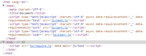 既然文件加载有效,那requireJS是怎么实现加载的呢? 我们打开工具发现body中并没有多出<script>标签,但是在<head>中发现了我们依赖的两个JS文件,requireJS是怎么加载的呢?
