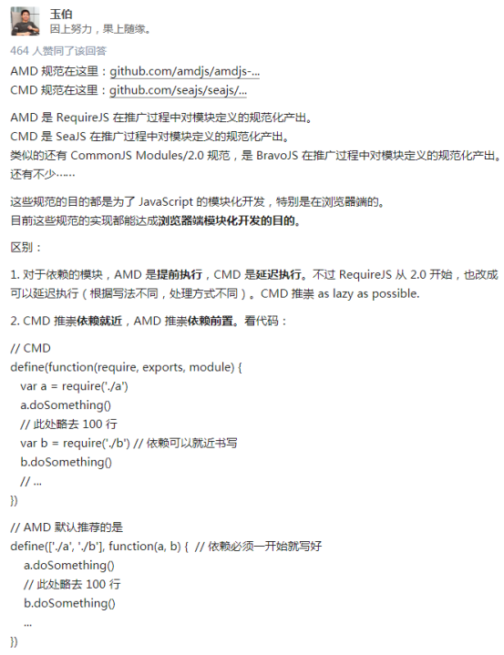 在百度上搜索 ’AMD CMD的区别‘ 在知乎上,seaJS的作者玉伯给出了非常明确的答案