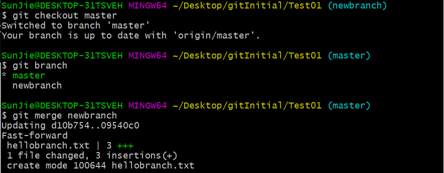 - 通过 git branch 查看分支和当前所在分支,带星号表示所在分支,通过 git branch newbranch 新建分支 newbranch,git checkout newbranch 切换到新建分支,再次查看状态,newbranch 前面出现星号,切换成功,touch hellobranch.txt 在工作区新建文件,并编辑文件添加内容