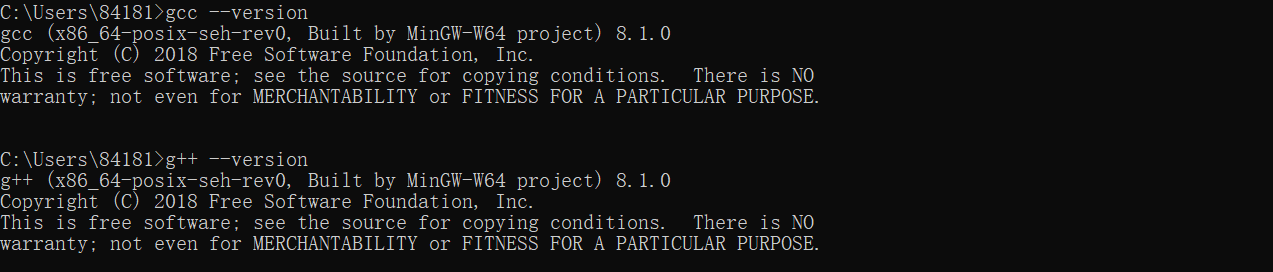 WIN+R cmd,打开DOS窗口,测试MinGW是否安装成功,注意,如果命令版本号不一致可能是因为之前安装的应用带有这些命令,被覆盖了。