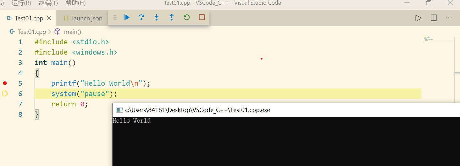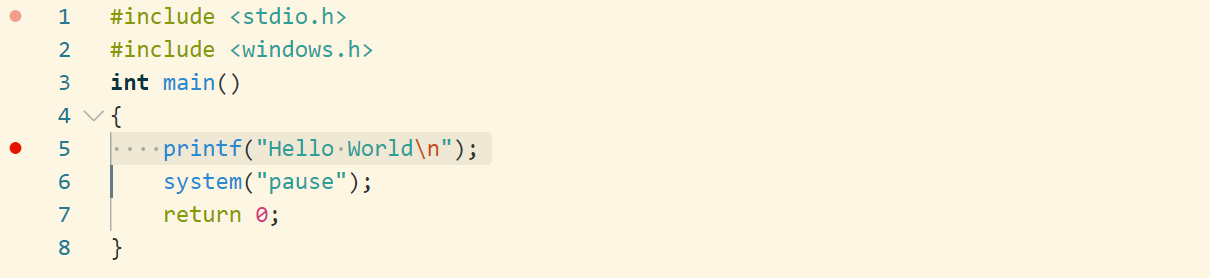 1 #include <stdio.h> 2 #include <windows.h> 3 int main() 4 { 5 printf("Hello World\n"); 6 system("pause"); 7 return 0; 8 }