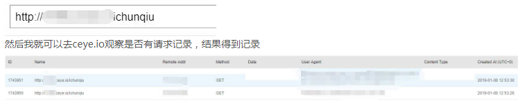 那么这种地方,也是可能存在SSRF的,不过当我们输入ceye.io却发现并没有回显请求,这是因为这种地方一般会对后缀做一个检测,如果不是jpg或者其他图片后缀的话并不会通过,不过好在ceye.io是很强大的,我们可以随便构造,abcdef.ceye.io/ichunqiu.jpg, 对其进行输入,再去观察有无回显,结果有了: