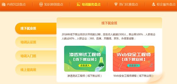 2018年培训班开班数总计45期,招生总人数超5000人,覆盖全国一线城市达60%,线下班就业率100%,入职名企学员数占60%,入驻企业:360、百度、天融信、京东、永信至诚等;认证培训班通过率高达96%,线上入门班课程完成率超95%。