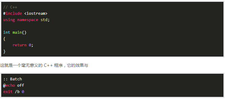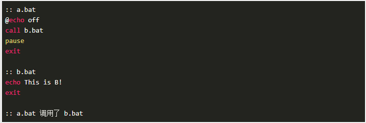 如果我们不加上这个参数(/b),那么退出的会是整个程序。但是我们加上,我们退出的就仅仅是当前的程序。如果我们单独执行b.bat,我们得到的是一个闪框,因为它本身被自己的exit给结束了。但是当我们用a.bat去调用b.bat的时候,exit /b 233只会退出当前程序,于是b.bat调用后遇到了exit /b 233,退出了b.bat,继续执行a.bat的call下面的代码,即pause。