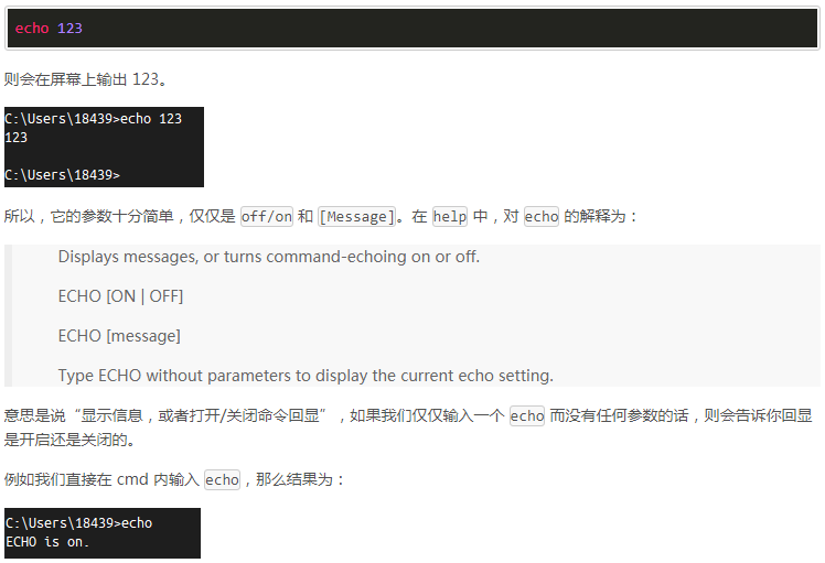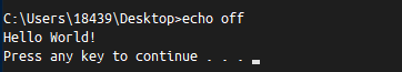 我们得到了与先前类似的输出,但是我们却发现echo off本身的执行依然看得到回显,这样我们的@就起到作用了,它隐藏单条指令的回显。
