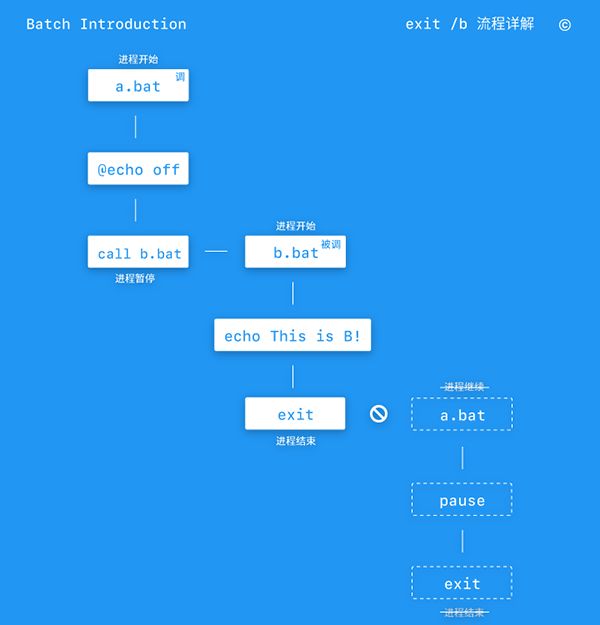 参数/b指定一个退出的代码,称为exitCode。exit /b [exitCode] 类似于其它语言中函数的return一样,返回一个值(不过 exitCode 只能为数字),并且执行以后进程就结束了。