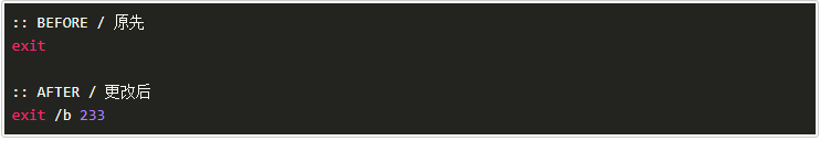 此外,exitCode还有另外的作用。例如上面,我们执行了exit /b 233,则代表我们的exitCode就是233,这样,在a.bat内的%ERRORLEVEL%会被设置为这个exitCode即%ERRORLEVEL% == 233。