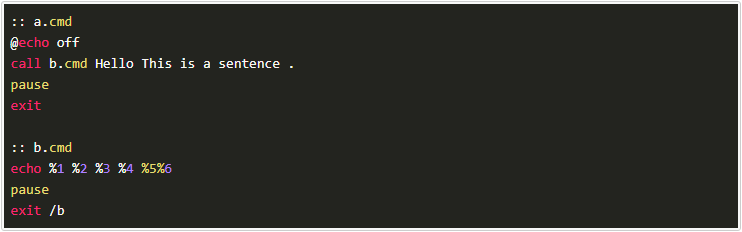 因此在被调用方b.cmd里,%1就代表Hello,%2就代表This,%3就代表is,以此类推。在上面的例子中,b.cmd内,%5%6写在了一起,因为%6的值是一个 .,与%5连用,结果则是sentence.。如果依然隔开,那么就是sentence .,显示并不自然。