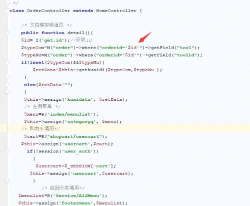 在文件Application\Home\Controller\OrderController.class.php中的detail方法,通过I方法获取id参数。