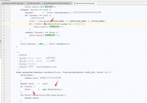 继续分析,怎么调用到getAuthList这个方法的,在Application\Admin\Controller\AdminController.class.php控制器中,调用了checkRule方法,在checkRule方法实列了Auth类,并调用了check方法。