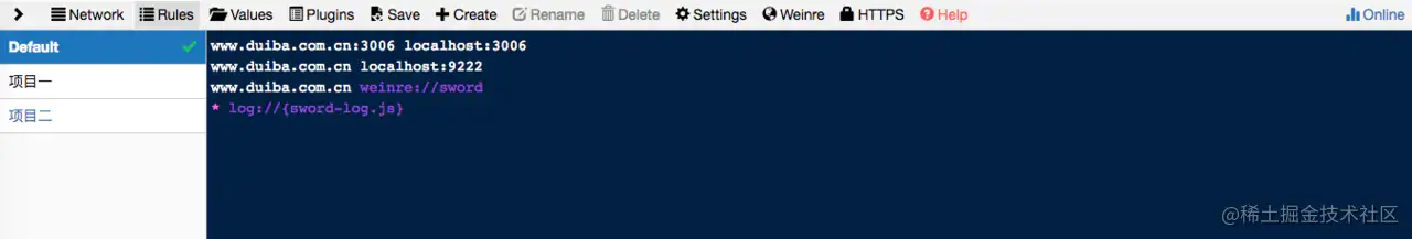 简单介绍下配置做了什么。 前两个就是简单地将请求映射到本地。 第三条配置会拦截www.duiba.com.cn 的请求,并在html中注入一端weinre脚本。拦截成功就可以通过访问http://x.x.x.x:8899/weinre/client/#sword 访问对应的开发者工具进行调试。