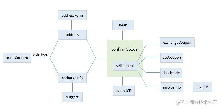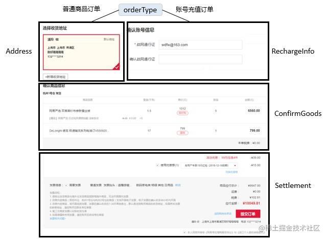 根据同步字段orderType,来确定是普通商品订单还是账号充值订单,并初始化对应的组件;根据同步信息,异步获取下单信息(含商品信息及结算信息);如果是普通商品订单,服务端会根据用户所选地址进行拆单,返回拆单后的商品和结算信息。按功能拆分后,组件及组件的嵌套关系如下: