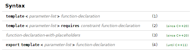 Parameter-list: 非空且都好分割的模板参数,每个是non-type parameter, type parameter, template parameter 或者 这些的parameter pack(参数包)。{ 即:非类型参数, 类型参数, 模板参数,或者是上述参数包}。自C++20, 这些参数可能倍constrained。