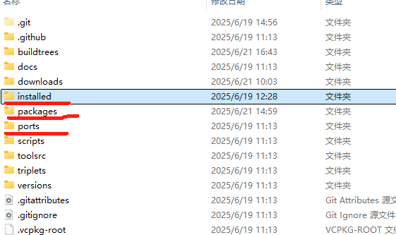 ports:是所有vcpkg可以下载的库的目录,并没有被安装。