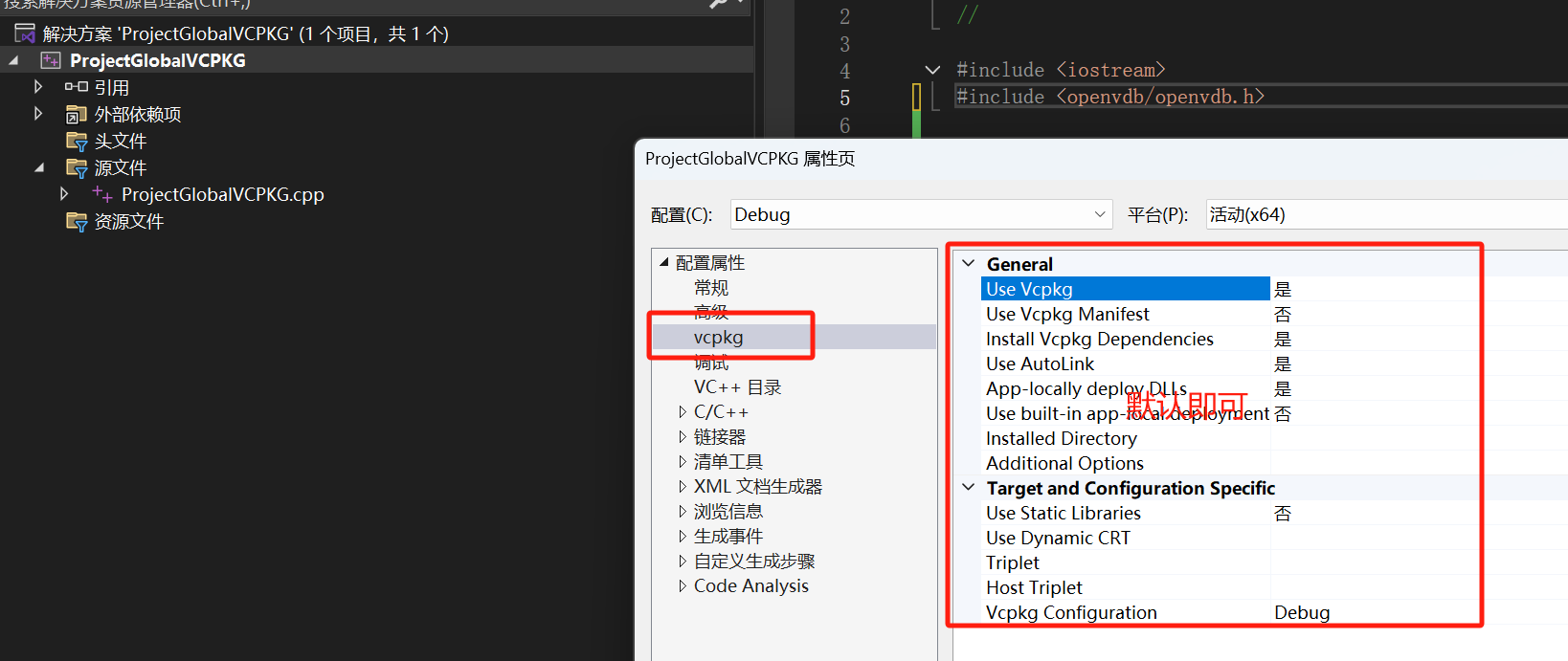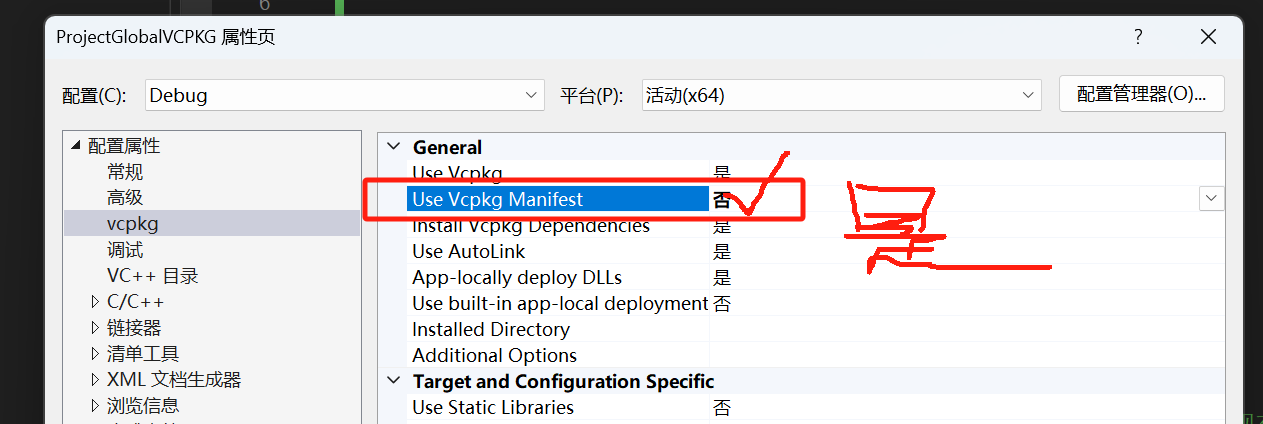 启用项目的属性配置的“清单manifest”:勾选use vcpkg manifest