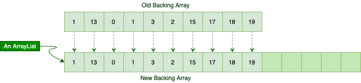 在内部,ArrayList 使用数组来实现 List 接口。由于数组在 Java 中是固定大小的,因此 ArrayList 创建一个具有一些初始容量的数组。在此过程中,如果我们需要存储比默认容量更多的项,它将用一个新的、更大的数组替换该数组。
