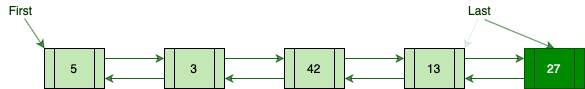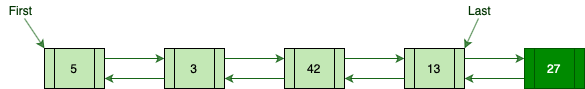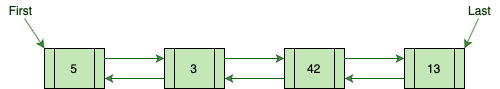 每个节点维护两个指针:一个指向下一个元素,另一个指向前一个元素。对此进行扩展,双向链表有两个指向第一项和最后一项的指针。