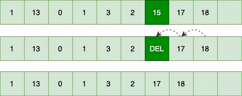 假设我们要从 ArrayList 中删除索引 6,它对应于我们的后备数组中的元素 15: