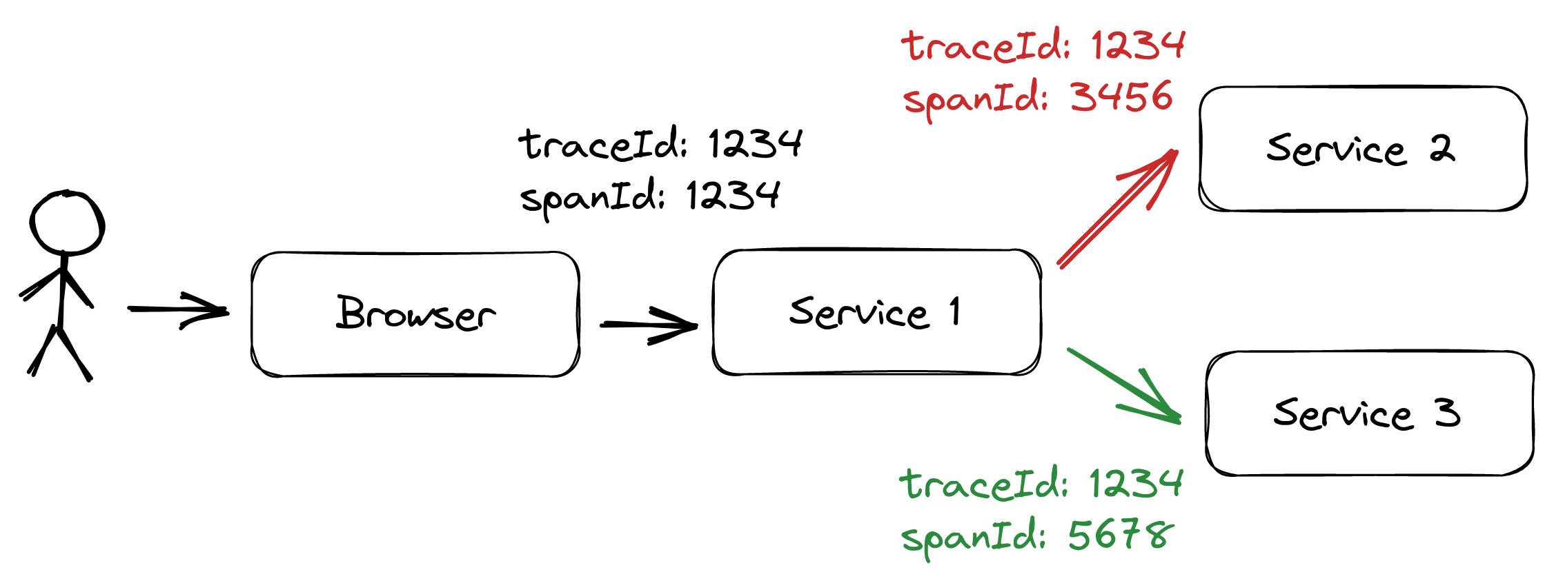 对于每个传出请求,服务 1 还会创建一个唯一的“跨度 ID”。虽然跟踪跨越服务 1 的整个请求/响应周期,但跨度仅跨越一个服务和另一个服务之间的请求/响应周期。