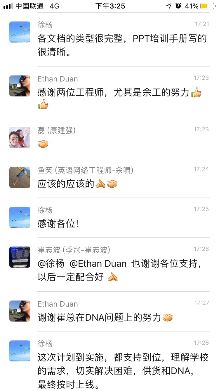 并且,学校对季冠公司此次网络升级改造也是赞不绝口,在项目群中,为项目成员疯狂打Call: