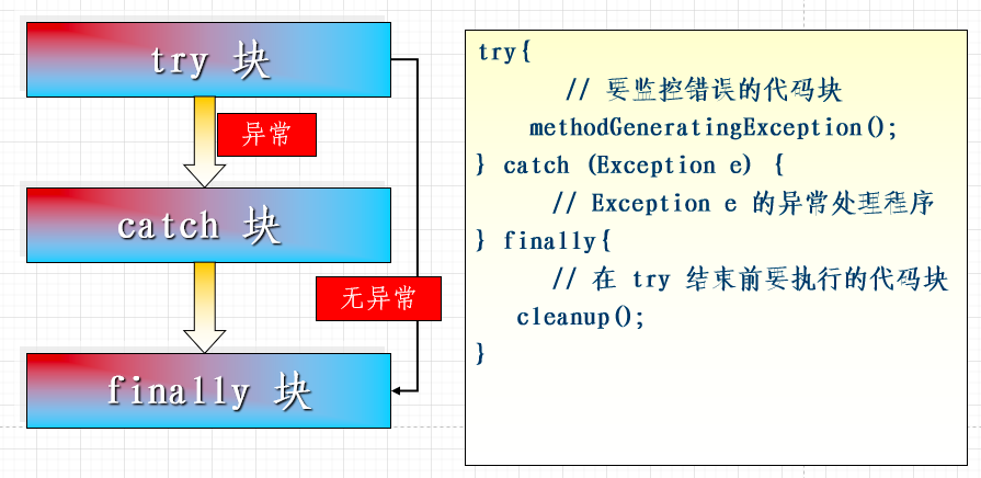 - 当Java运行时系统接收到异常对象时,会寻找能处理这一异常的代码并把当前异常对象交给其处理,这一过程称为捕获(catch)异常。