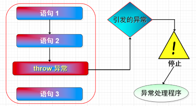 - Java程序在执行过程中如出现异常,会自动生成一个异常类对象,该异常对象将被提交给Java运行时系统,这个过程称为抛出(throw)异常。