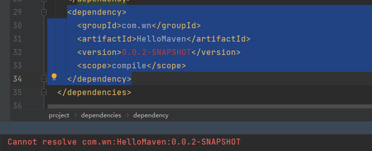 由于本地仓库没有version为如果0.0.2-SNAPSHOT版本的HelloMaven,加载依赖时会报错