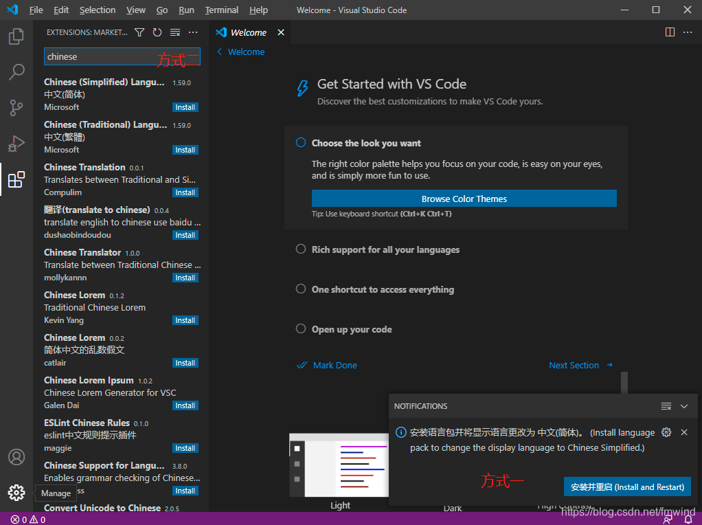 安装完之后会有提示安装中文插件,或者扩展插件中搜索chinese,然后安装